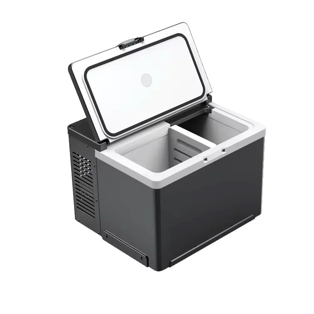Модель Alpicool ARC35 – идеальный холодильник для туристических автобусов, домов на колесах и грузовых автомобилей. Он прост в установке, компактный размер, надежный и функционый. Вес модели – всего 15 кг. Объем внутренней камеры – 35 л. , она может быть использована целиком или разделена на две части съемной перегородкой. Во таком случае с правой стороны размещают продукты для охлаждения, а с левой – для глубокой заморозки. В холодильнике можно устанавливать температуру от -20 до +20 °С. Для удобного управления настройками есть LED-дисплей. Инверторный компрессор работает тихо (до 45 Дб. Крышка фиксируется на защелку. Внутренняя камера подсвечивается светодиодными лампами. Холодильник может работать от автомобильного прикуривателя или сети на 220 в (через адаптер,покупается отдельно), либо в автономном режиме от АКБ.