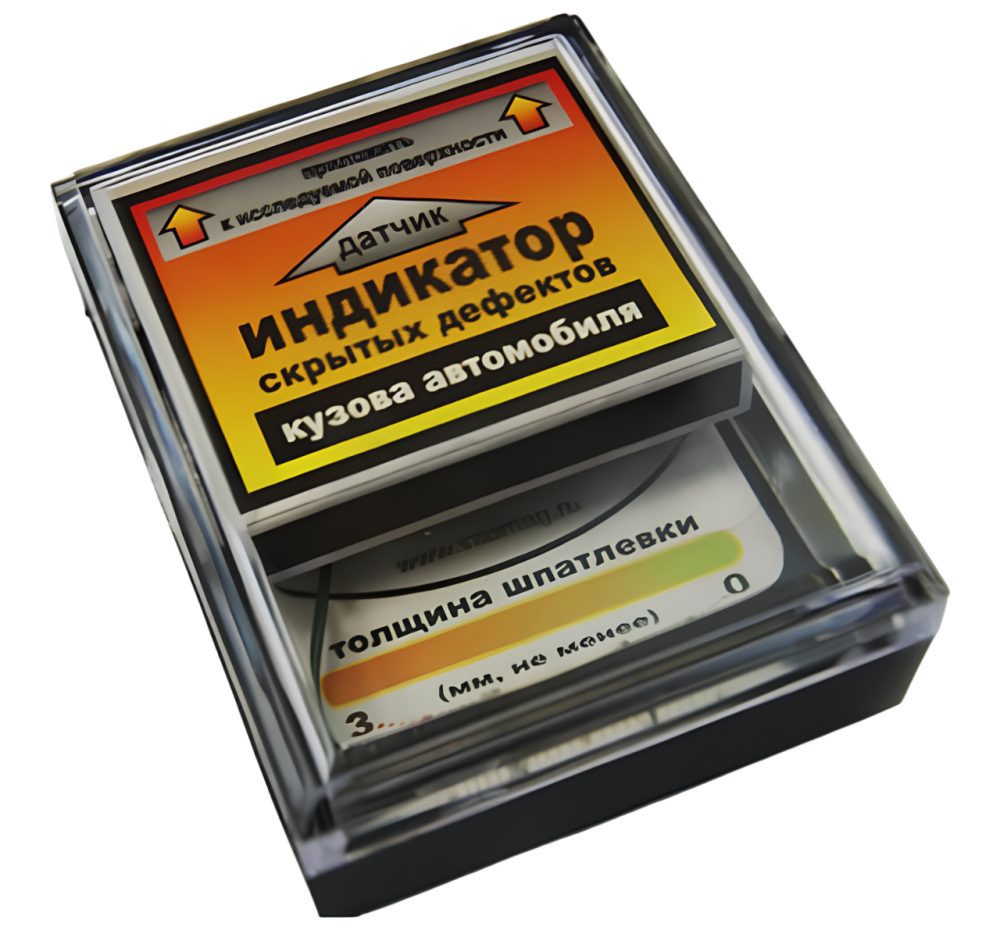 Индикатор дефектов предназначен для быстрого поиска повреждений кузова скрытых шпатлевкой и лакокрасочным материалом. Он позволяет оценить толщину шпатлевки под краской на стальных деталях. Индикатор дефектов кузова (ИДК) имеет малые габариты и не требует установки элементов питания. Магнитный детектор с диапазоном измерения 0-3 мм. Корпус из пластика.