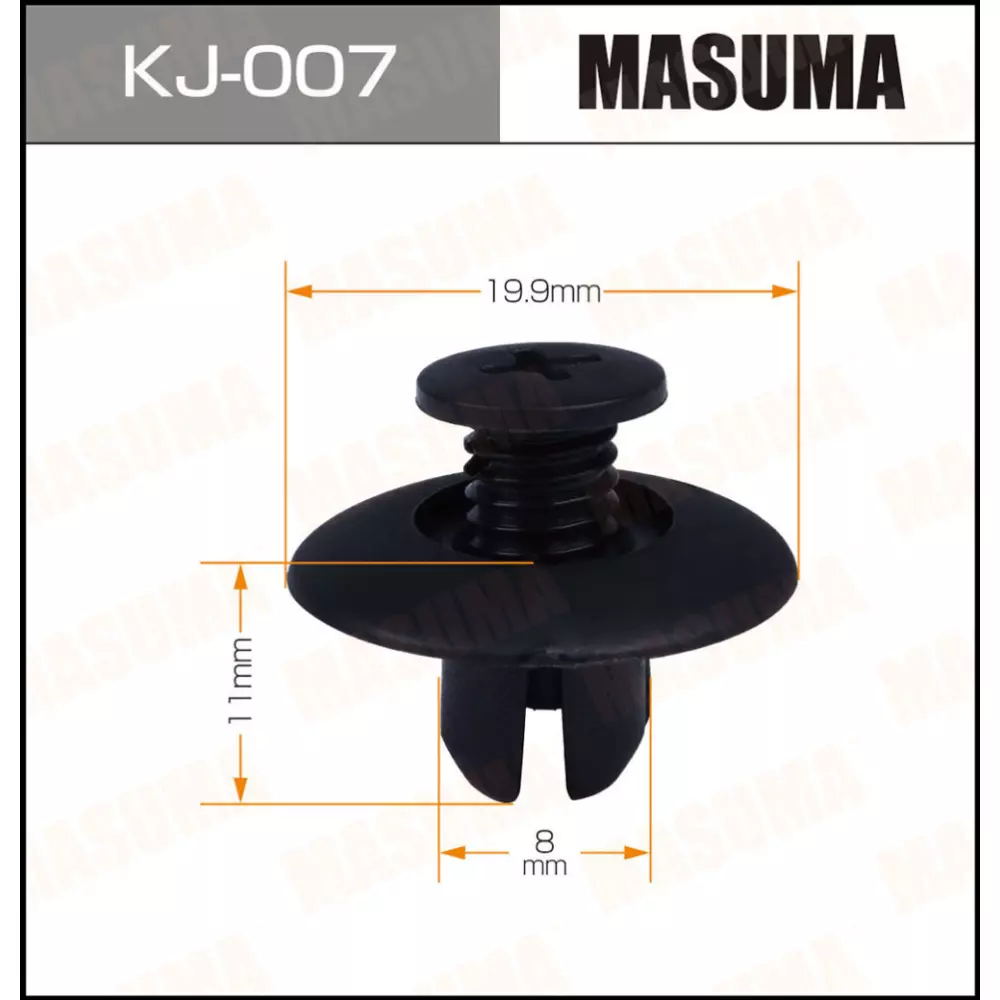 Masuma — один из крупнейших в мире производителей клипс для автомобилей. Автомобильная клипса (пистон, зажим) — это пластмассовая деталь, предназначенная для крепежа облицовочной и изоляционной части автомобиля. В ассортименте бренда есть клипсы для крепления практически любого элемента отделки машины. Клипсы отличаются повышенной прочностью и износостойкостью.