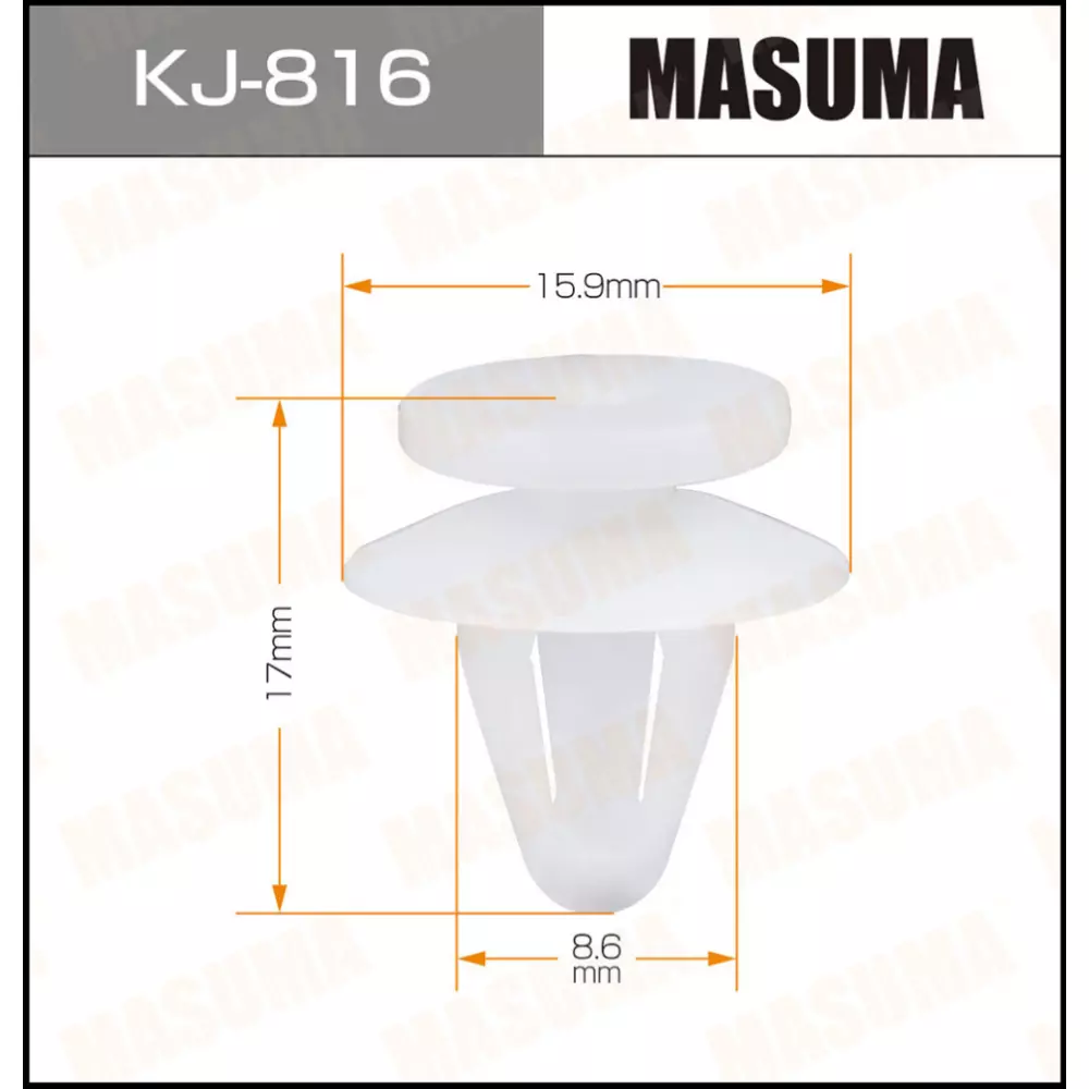 Masuma — один из крупнейших в мире производителей клипс для автомобилей. Автомобильная клипса (пистон, зажим) — это пластмассовая деталь, предназначенная для крепежа облицовочной и изоляционной части автомобиля. В ассортименте бренда есть клипсы для крепления практически любого элемента отделки машины. Клипсы отличаются повышенной прочностью и износостойкостью.