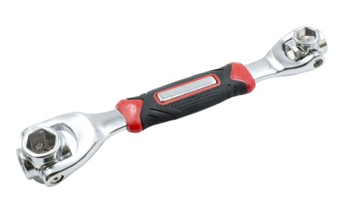 Универсальный ключ. Он имеет вращающуюся головку на 360° на каждом конце, поэтому вы можете легко найти инструмент, необходимый для гаек и болтов любого размера и формы. Для удобства использования он регулируется под углом 45°, поэтому вы можете справиться с любыми труднодоступными гайками и болтами. Имеет 8 головок для гаек и болтов диаметром 12-19мм.