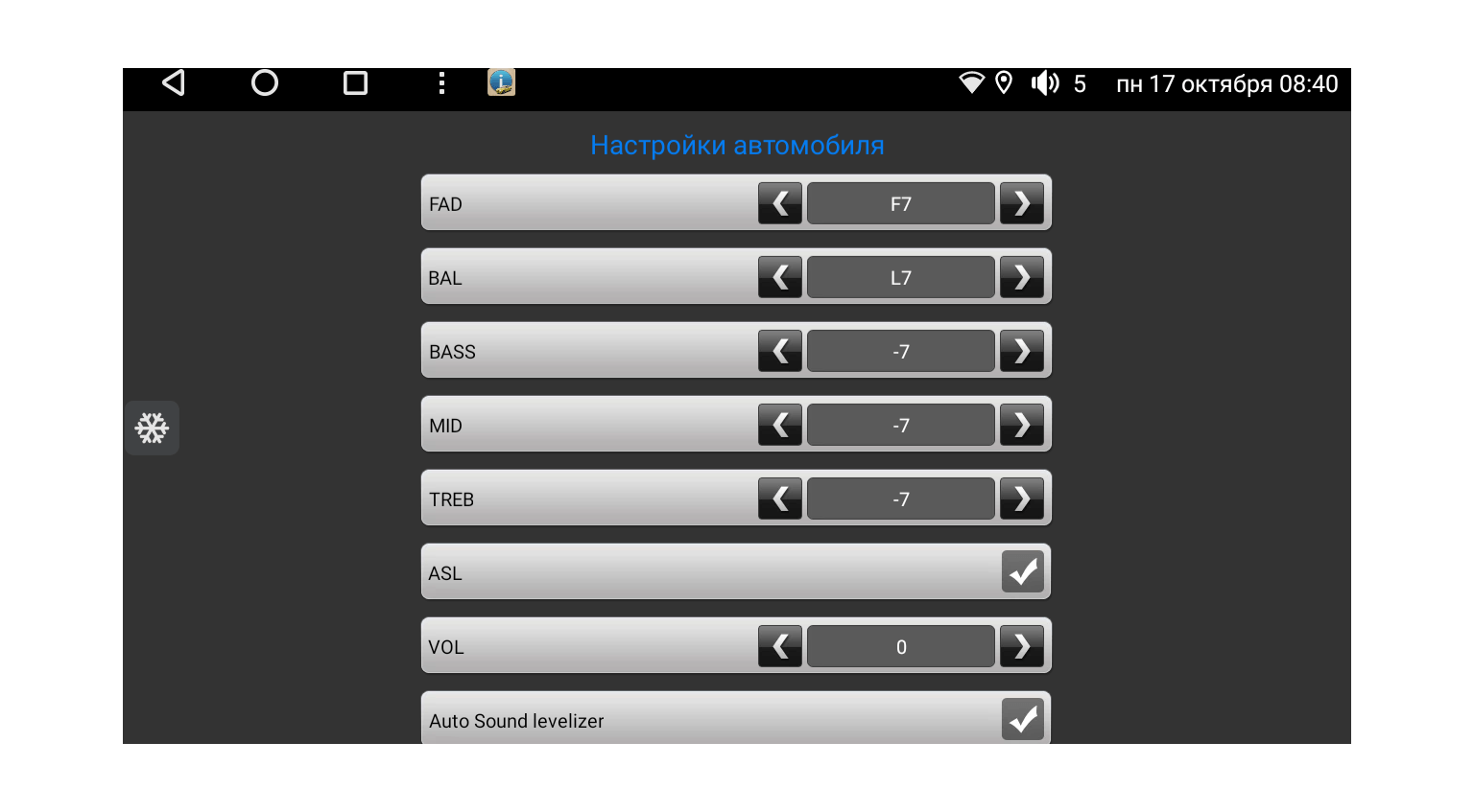 Как только закончите с настройкой громкости, больше не меняйте значение громкости штатного усилителя, а делайте тише или громче средствами Android. Можете приступать к настройке баланса и фейдера, а также к настройке низких, средних и высоких частот.