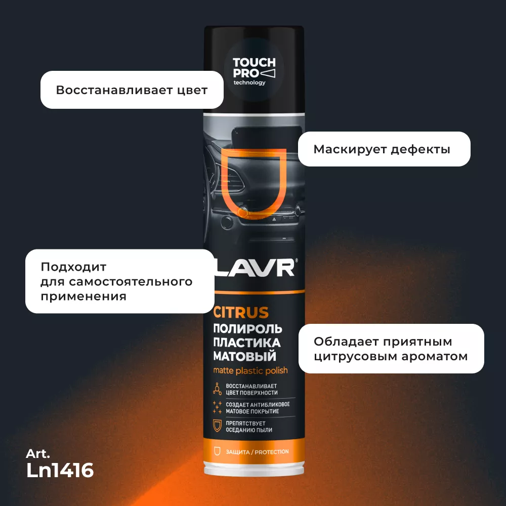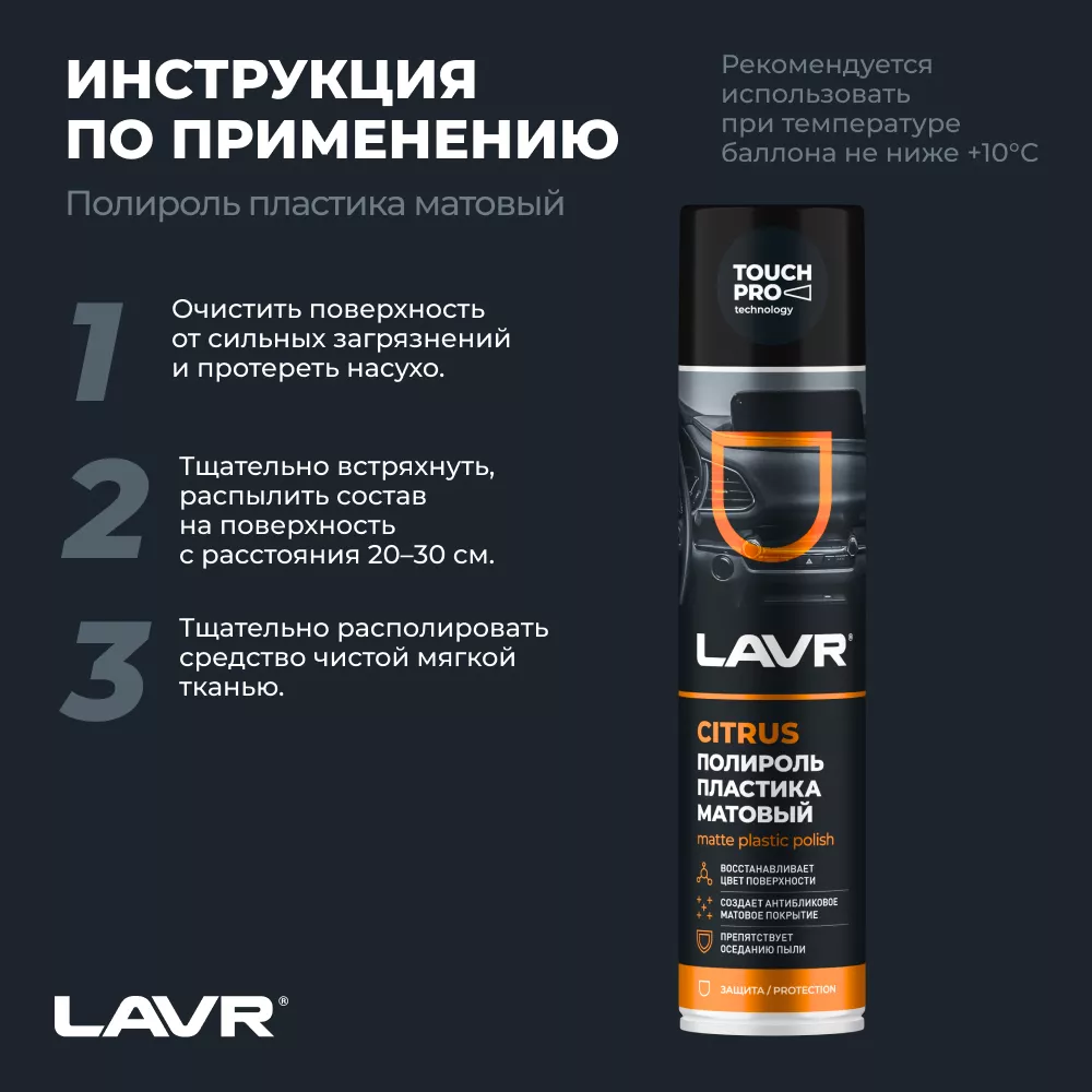 Средство для ухода и восстановления пластиковых, резиновых и виниловых поверхностей автомобиля. Возвращает первоначальную новизну и создает антибликовое матовое покрытие. Придает поверхности антистатический эффект, препятствующий оседанию пыли. Подходит для обработки гладких и пористых поверхностей.
