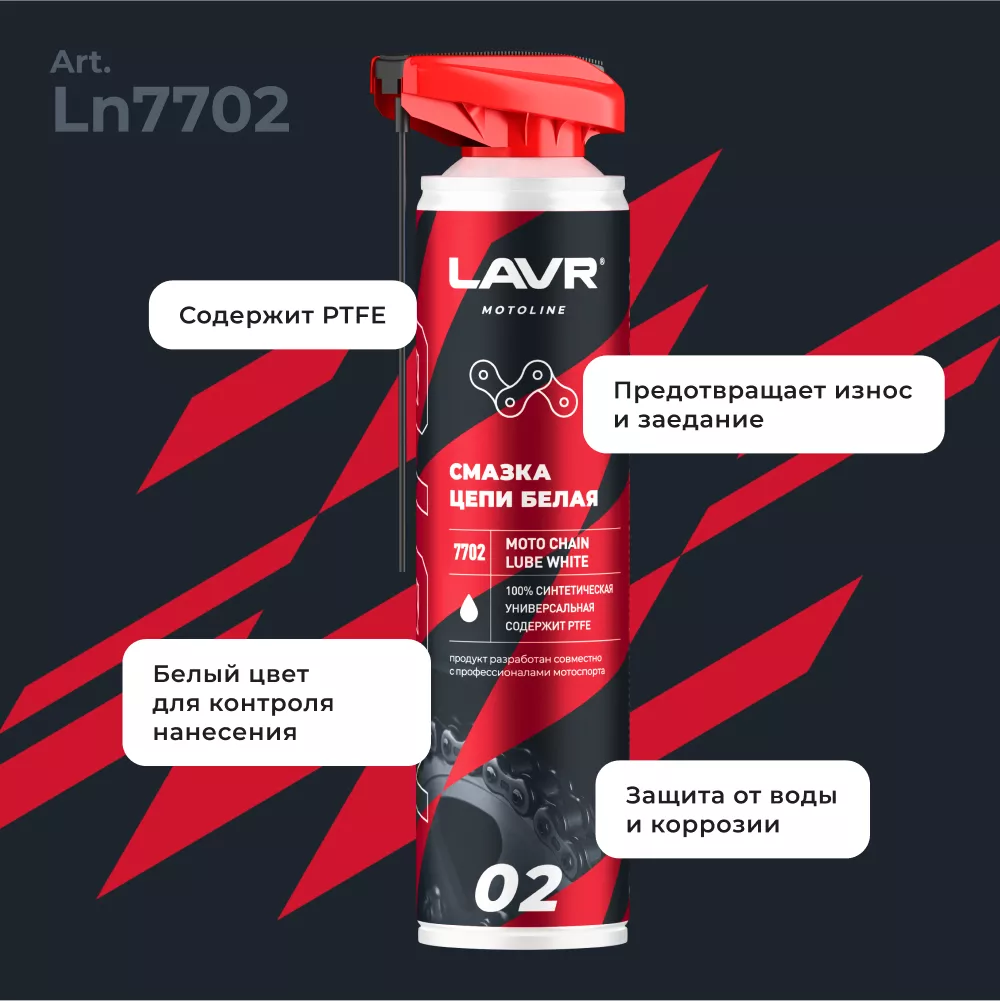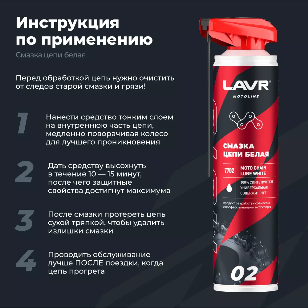 Перед обработкой цепь очистить от следов старой смазки и грязи с помощью Очистителя цепи Ln7701. Тщательно встряхнуть баллон перед использованием.