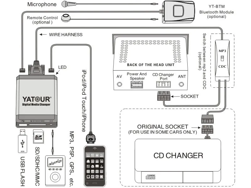 Слот для карт SD поддерживает карты памяти SD/SDHC/MMC, USB совместим с флеш-носителями USB2.0. YATOUR поддерживает USB/SD/SDHC/MMC до 32GB. Внимание : USB слот совместим только с носителями USB 2.0, не рекомендуется подключать ничего кроме данных носителей.