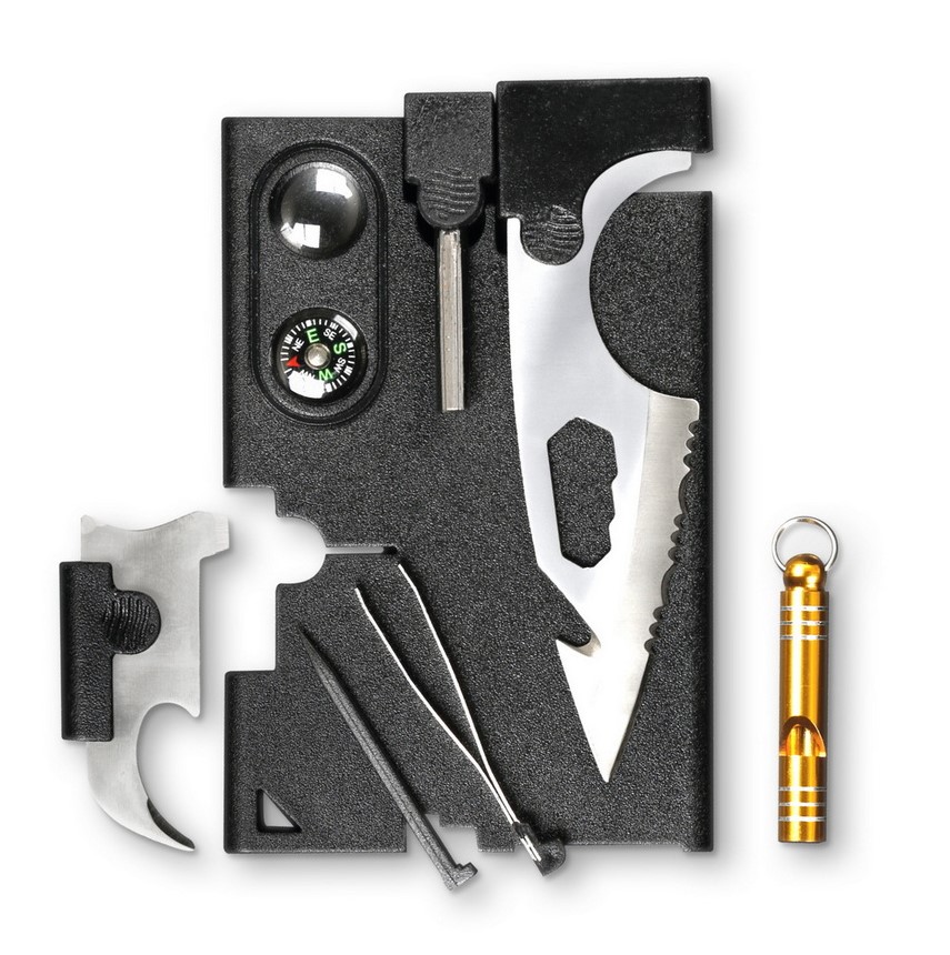 Комплектация - Функции: свисток;лупа;компас;нож-пила;заточн. блок;зубочистка;пинцет;огниво;ключ 8-10 мм;отвертка - открывашка