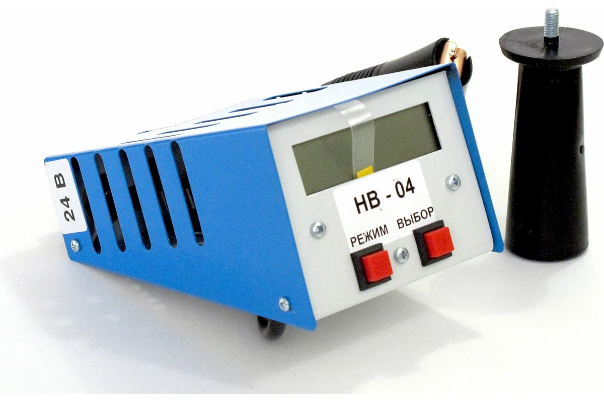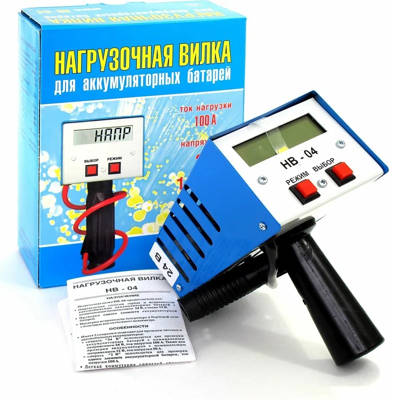 Нагрузочная электронная вилка Вымпел 100А, 2/12/24В НВ-04 2004 представляет собой цифровой вольтметр с ручкой для удержания и двумя спиралями для удобной коммутации. Прибор позволяет определять неисправности в автомобильном аккумуляторе, бортовой сети и генераторе, а также определять уровень заряда аккумулятора с напряжением 12 и 24 В.