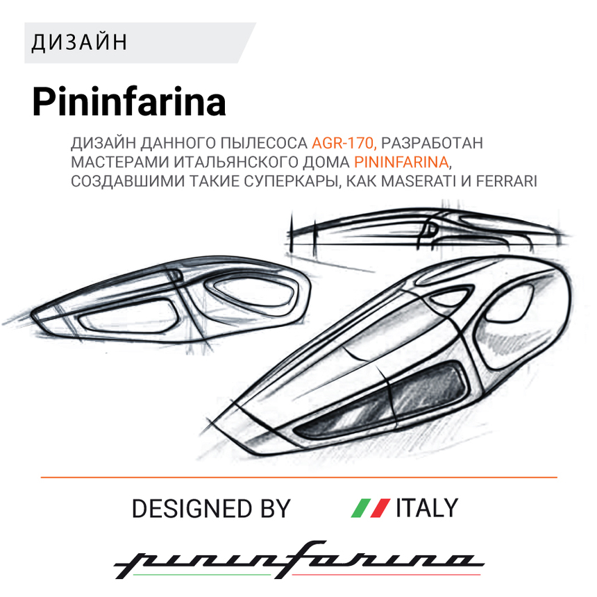 Конструкция и дизайн автомобильных пылесосов серии AGR-170 разработаны мастерами итальянского дизайнерского дома Pininfarina, создавшими такие суперкары, как Maserati Birdcage 75th и Ferrari FF.