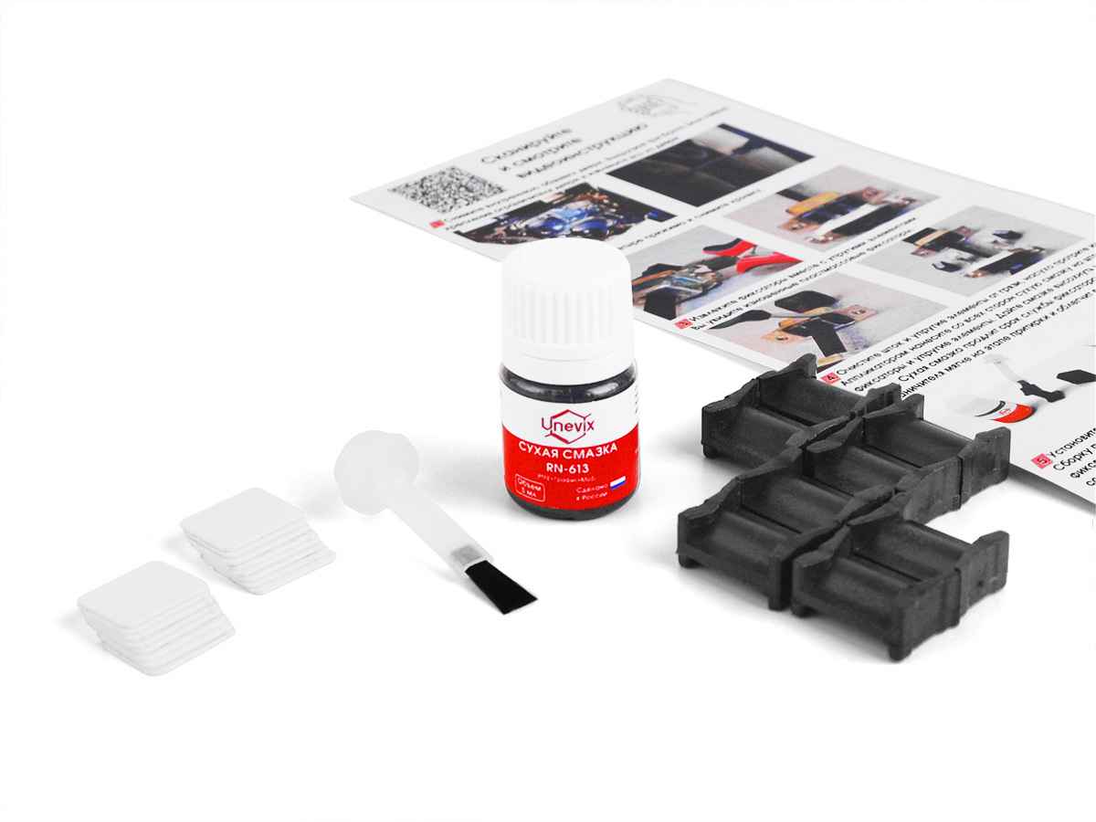 фиксаторы - 8 шт. компенсационные пластины - 8 шт. сухая смазка - 2 мл. аппликатор - 1 шт. инструкция по установке - 1 шт.