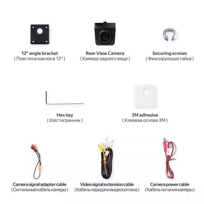 Универсальная камера заднего вида, крепления, двухсторонний скотч, вся необходимые провода для подключения.
