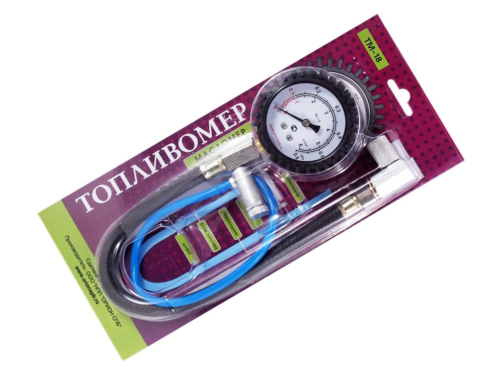 Измеритель давления топлива (топливомер) и давления масла ТМ-18 используется для измерения давления в системах впрыска топлива инжекторных автомобилей ВАЗ (8 и 16 клапанных), и некоторых иномарок. Также ТМ-18 используется для измерения давления в системах подачи масла для смазки элементов двигателя. Укомплектован наконечником с резъбой М14х1.5. Подходит для двигателей автомобилей ВАЗ, Alfa Romeo, Citroen, Fiat, Lancia, Opel, Peugeot, Renault, Saab, Seat, Volvo и др.