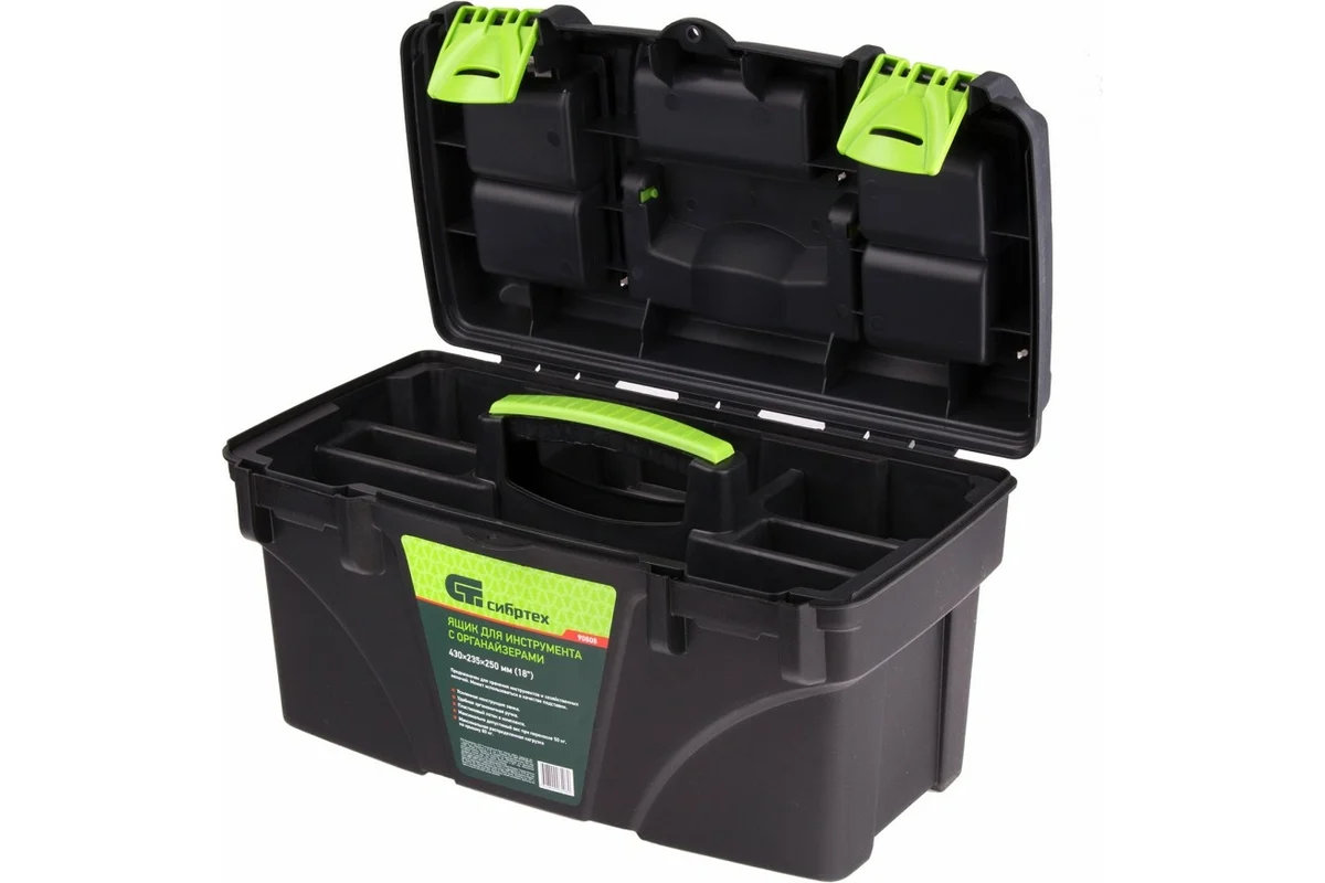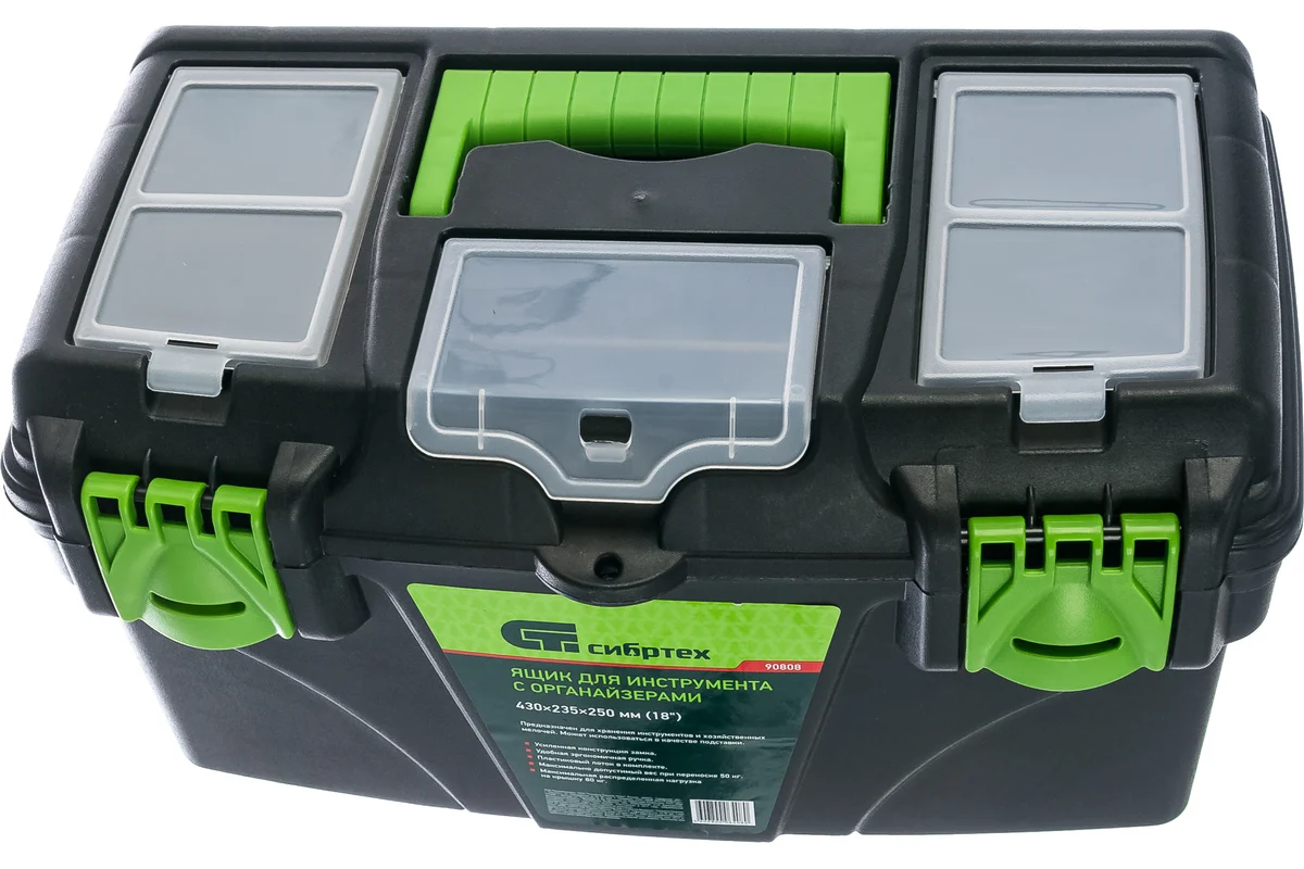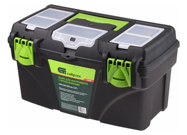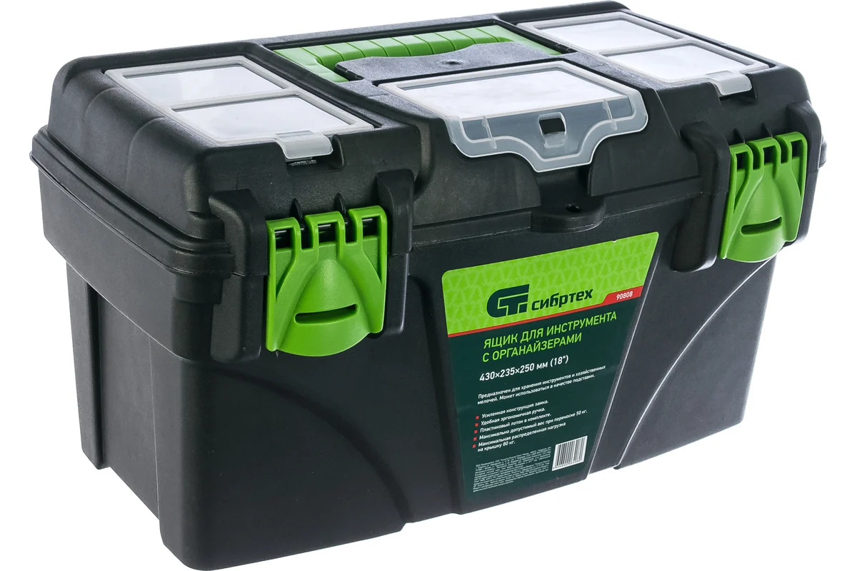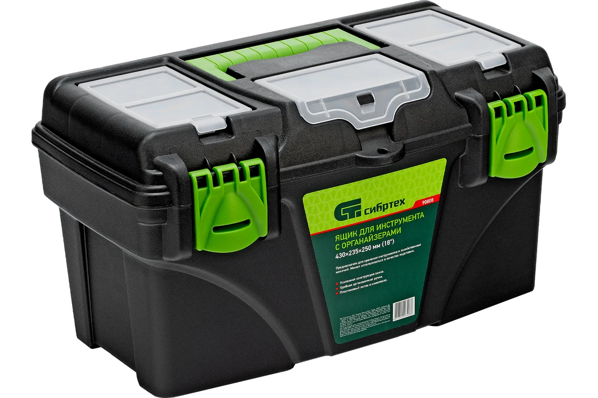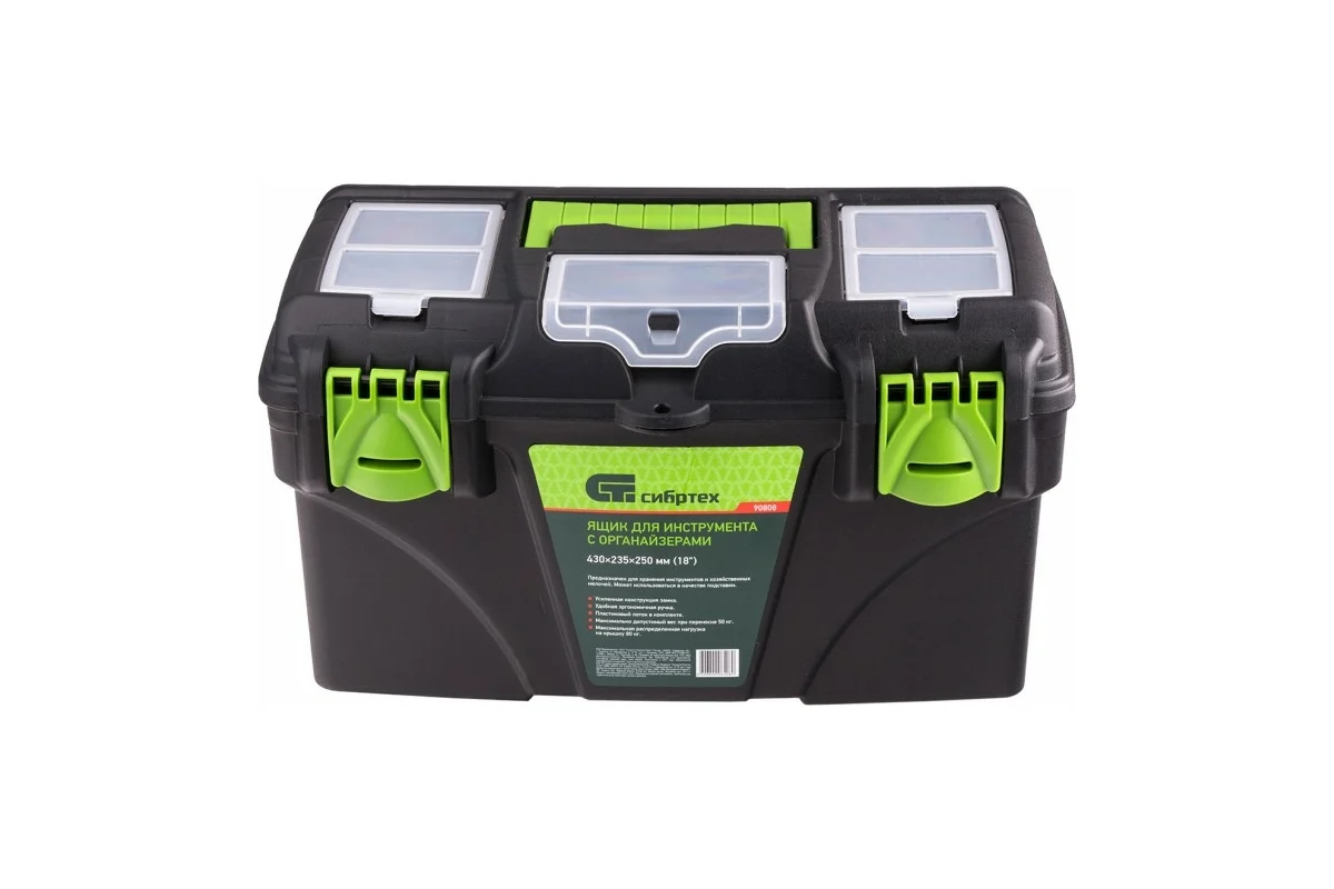 Ящик Сибртех 90808, 18 дюймов, с органайзерами, используется для хранения и транспортировки инструментов, оснастки, крепежей, хозяйственных мелочей и других предметов. Крышка и замок усилены трехрядными петлями, поэтому он выдерживает вес содержимого до 50 кг. Ящик можно брать в поездку, также он пригодится дома, на даче или в гараже.