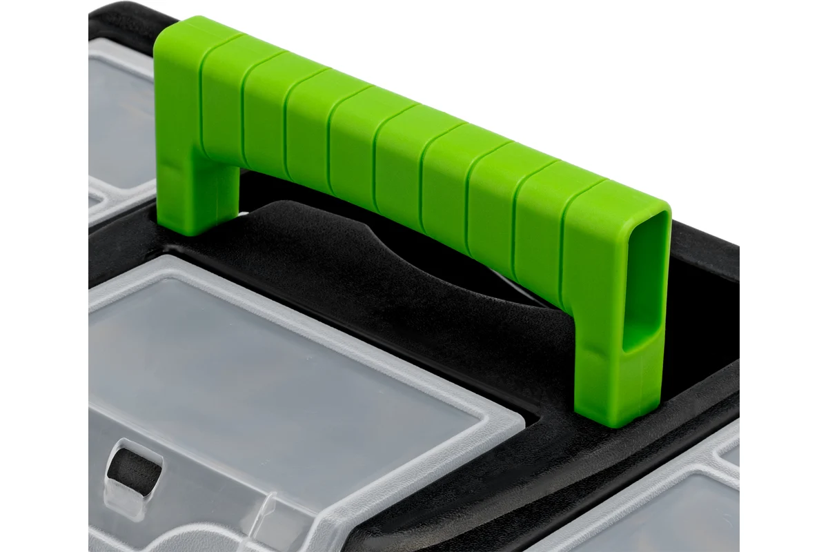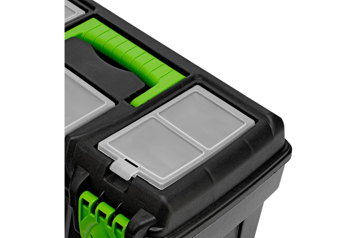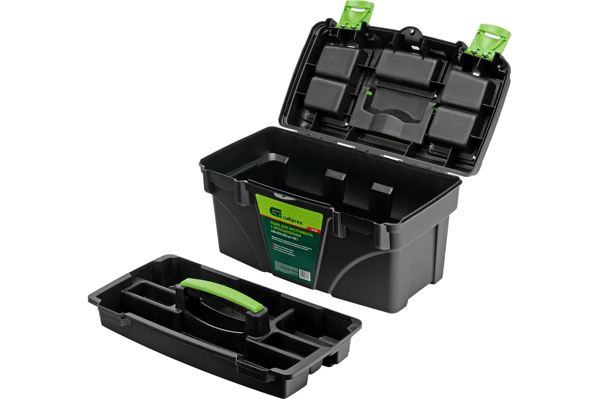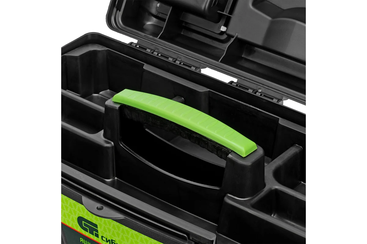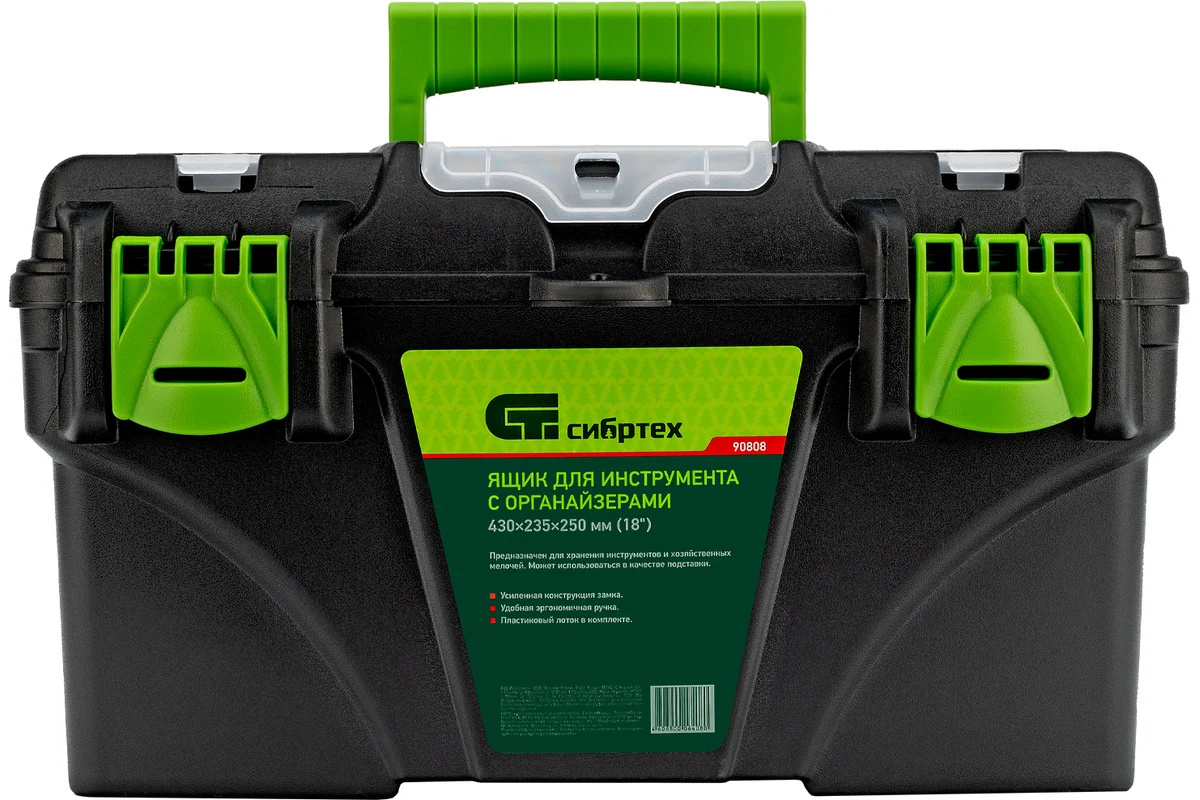 Ящик Сибртех 90808, 18 дюймов, с органайзерами, используется для хранения и транспортировки инструментов, оснастки, крепежей, хозяйственных мелочей и других предметов. Крышка и замок усилены трехрядными петлями, поэтому он выдерживает вес содержимого до 50 кг. Ящик можно брать в поездку, также он пригодится дома, на даче или в гараже.