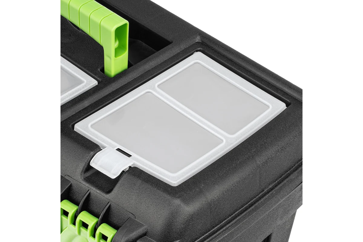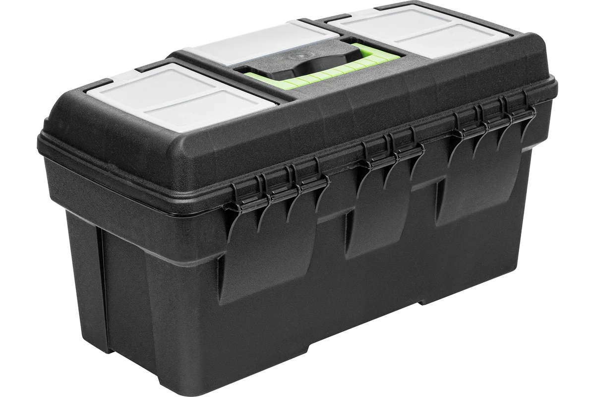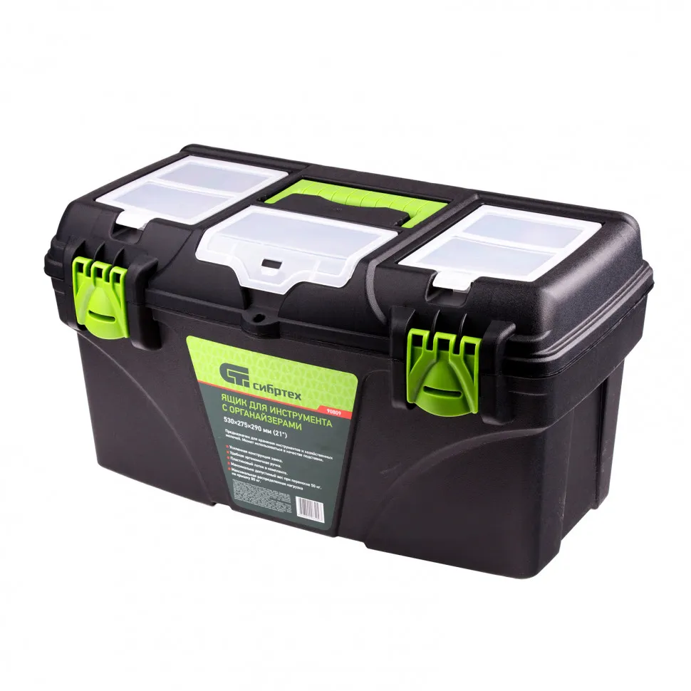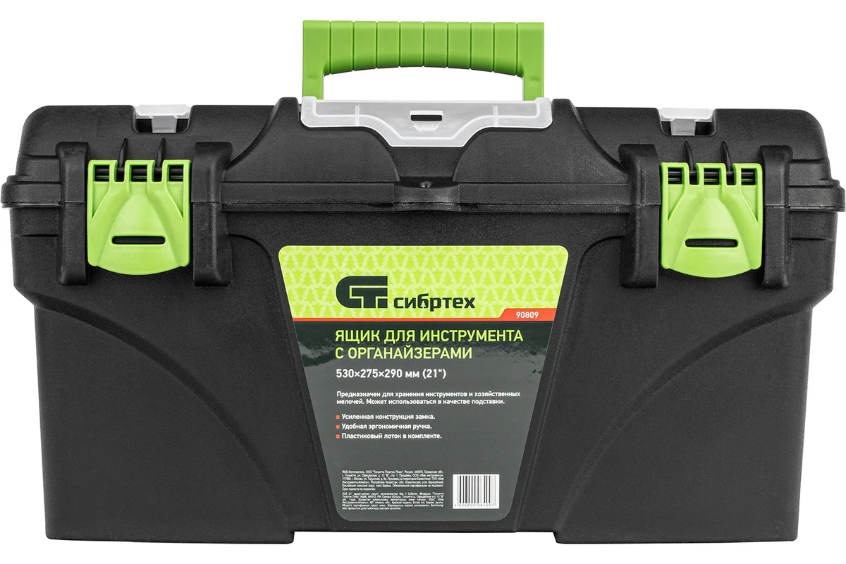 Ящик Сибртех 90809, 21 дюйм, с органайзерами, используется для хранения и транспортировки инструментов, оснастки, крепежей, хозяйственных мелочей и других предметов. Крышка и замок усилены трехрядными петлями, поэтому он выдерживает вес содержимого до 50 кг. Ящик можно брать в поездку, также он пригодится дома, на даче или в гараже. Преимущества - В крышке предусмотрены органайзеры, в которых можно рассортировать крепежи и другие мелкие детали. - Съемный лоток с ручкой позволяет оптимизировать пространство внутри ящика. - Удобная ручка облегчает транспортировку даже максимально заполненного ящика. - Ручка утапливается в крышке, поэтому при необходимости ящик может служить подставкой.