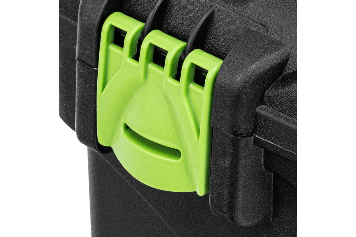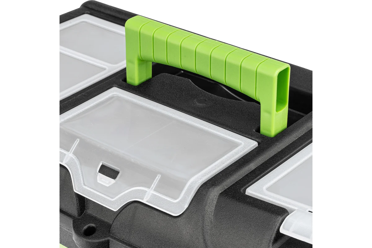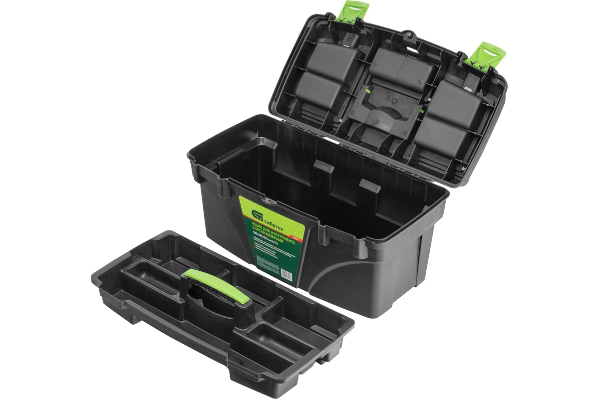 Ящик Сибртех 90809, 21 дюйм, с органайзерами, используется для хранения и транспортировки инструментов, оснастки, крепежей, хозяйственных мелочей и других предметов. Крышка и замок усилены трехрядными петлями, поэтому он выдерживает вес содержимого до 50 кг. Ящик можно брать в поездку, также он пригодится дома, на даче или в гараже. Преимущества - В крышке предусмотрены органайзеры, в которых можно рассортировать крепежи и другие мелкие детали. - Съемный лоток с ручкой позволяет оптимизировать пространство внутри ящика. - Удобная ручка облегчает транспортировку даже максимально заполненного ящика. - Ручка утапливается в крышке, поэтому при необходимости ящик может служить подставкой.